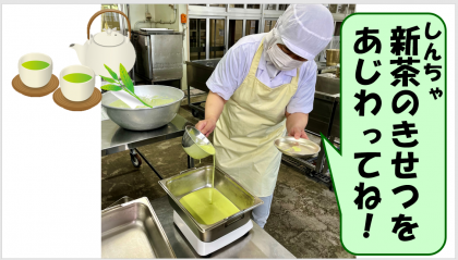 新茶の季節に合わせて、「まっ茶ういろう」が登場しました。給食室で手作りのデザートです。まっ茶と上新粉、砂糖、水、白いんげんのペーストを混ぜ合わせて、焼き物機で蒸して作っています。