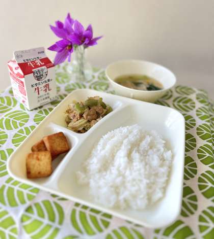 きょうの献立は、ごはん、ホイコウロー、中華スープ、あつあげのピリ辛じょうゆかけ、牛乳でした。