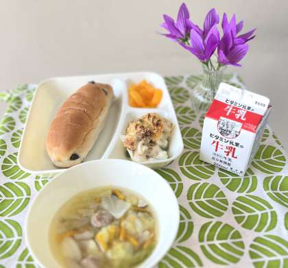 きょうの献立は、レーズンパン、マカロニグラタン、ウインナーとキャベツのスープ、みかん(缶)、牛乳でした。