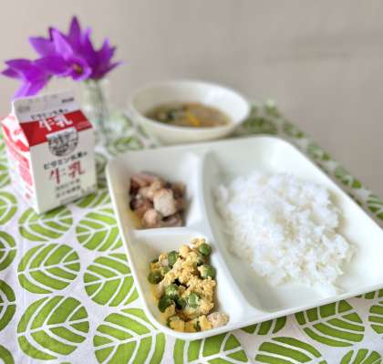 きょうの献立は、ごはん、さけのみそ焼き、五目汁、えんどうの卵とじ、牛乳でした。