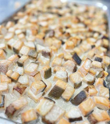 さけは、砂糖、みりん、うすくちしょうゆ、白みそ、綿実油で下味をつけて焼き物機で焼きます。味付け良く、おいしかったです。
