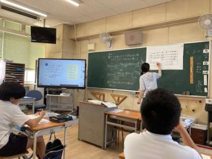 整数に分数をかける問題で、かける数と積の大きさの関係を調べていました。