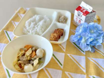 きょうの献立は、ごはん、八宝菜、あつあげの中華みそだれかけ、もやしの中華あえ、牛乳でした。