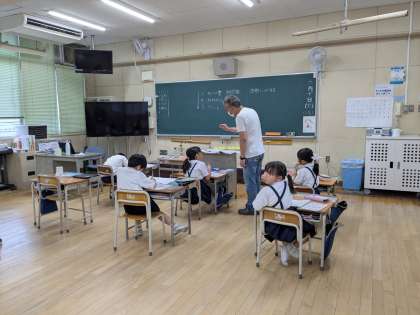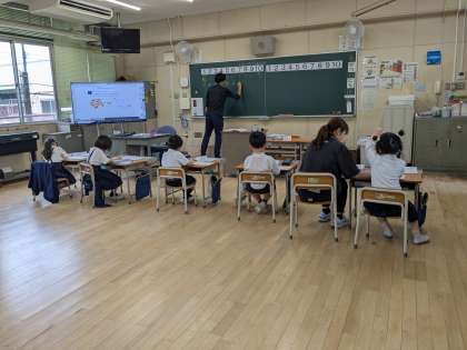 1年生は算数のたし算の学習でした。「増えると……」もたし算の式で表わせることを学習しました。2年生も算数の学習でした。長さの単元のまとめをしていました。定規を使って長さをはかったり直線を書いたりしていました。