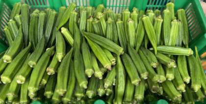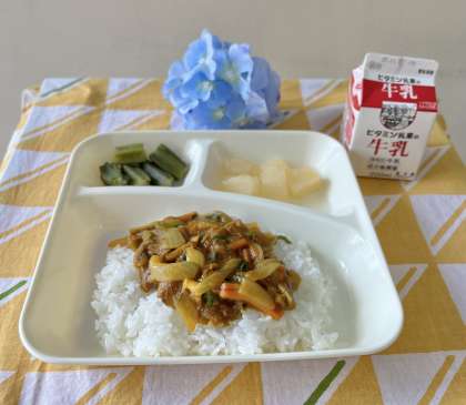 きょうの献立は、和風カレー丼、オクラの甘酢あえ、和なし(カット缶)、牛乳でした。
