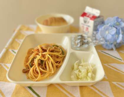 きょうの献立は、ミニコッペパン、チキントマトスパゲッティ、キャベツのピクルス、ミニフィッシュ、牛乳でした。