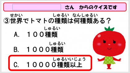 トマトの種類は、世界で10000種類以上もあるそうです。「多すぎる〜」「トマトとプチトマトしか知らんのに」と言っている子どもたちでした。