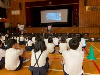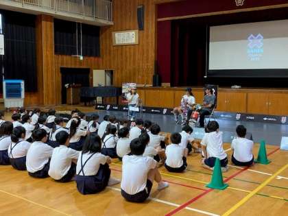 今日の5時間目、「XGAMES」に出場する選手2名が九条東小学校に来てくれました。「女子スケートボードパークとバート」に出場する、アリサ・トルー選手と「スケートボードバート」に出場する、芝田モト選手です。