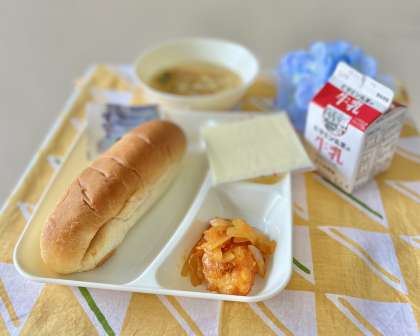 きょうの献立は、コッペパン、えびのチリソース、中華スープ、スライスチーズ、ブルーベリージャム、牛乳でした。