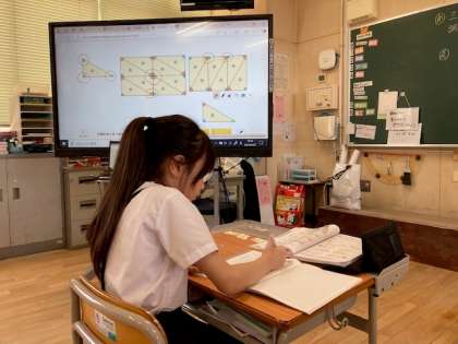 「三角形の3つの角の大きさの和を調べよう」に取り組みました。