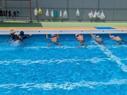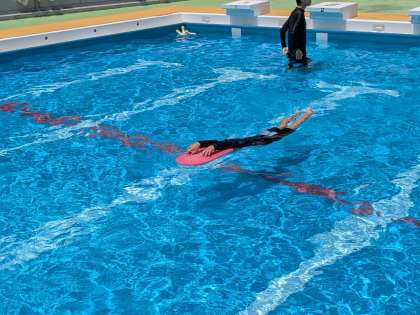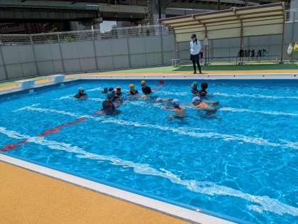 高学年も、インストラクターの方に指導を受けました。水の中ではしっかり息を吐くこと、足の裏で水をしっかり蹴ることなど、泳力を伸ばすコツを教えてもらいました。