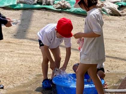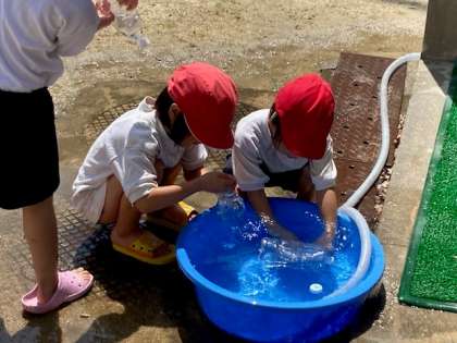 水をかけあったり、的あてをしたりして、水遊びを楽しみました。