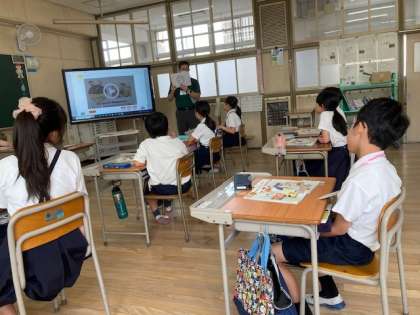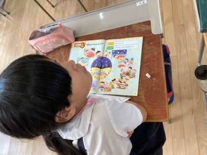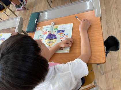 「What time is it ?」の問いに、時計を見て時間を答える練習をしました。
