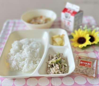 年1回登場のにがうり(ゴーヤ)は、給食室で調理員さんがしっかりとわたをとってくださったおかげで食べやすく仕上がっていました。