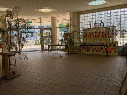 地域の方から頂いた笹に、七夕の短冊を飾っています。学校の玄関がとても華やかになりました。