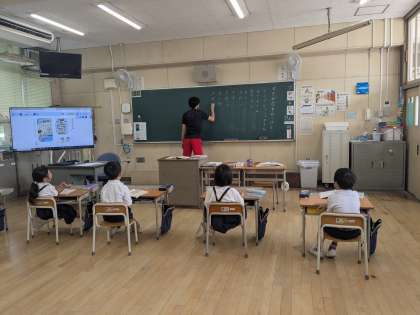 1年生は国語で、カタカナの言葉を見つけていました。黒板いっぱいの言葉を見つけて発表していました。