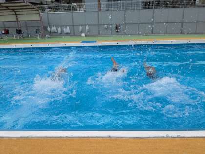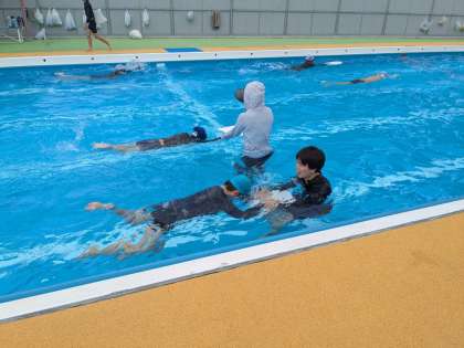 水慣れをした後、25mクロールに挑戦。息つぎやバタ足に気をつけながら頑張って泳ぎ、距離を伸ばしていました。