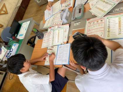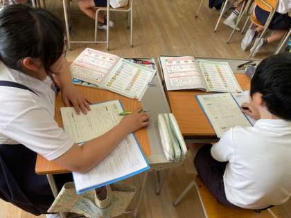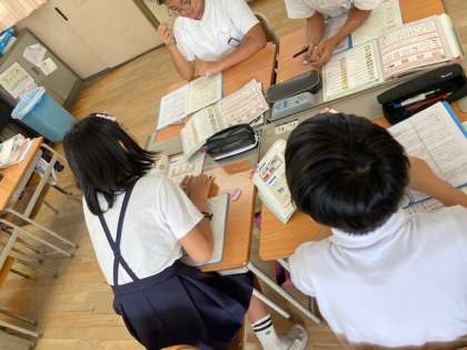 グループ学習の様子です。一日の生活を振り返り、いつもできているかどうかを英語で質問したり答えたりする練習です。毎日の歯みがきや食事の準備などについて、質問していました。