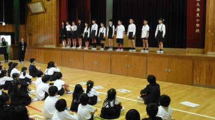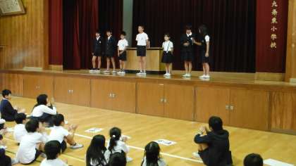 児童集会で学級代表と委員会の委員長がみんなの前であいさつをしました。それぞれ自分の抱負をしっかりと発表することができました。