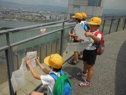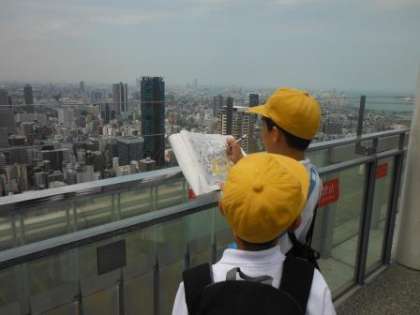 社会見学で環状線を一周しました。途中、大阪駅で降りて、スカイビルの空中庭園へ行きました。展望台からは、大阪市内の様子を眺めることができます。子どもたちは、淀川や京セラドーム、ユニバーサルスタジオジャパンなどを見つけ、楽しみながら学習していました。