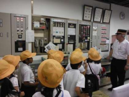 九条駅の駅長室も見せていただきました。いつもはカウンターの奥には、駅員さん以外は入れないそうですが、今回は特別に入ることができました。災害があった時にすぐにわかるようになっているしくみや、ホームに電車が入ってくる様子がうつしだされたモニターを見ることができました。