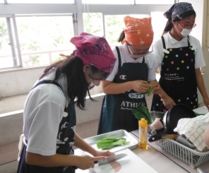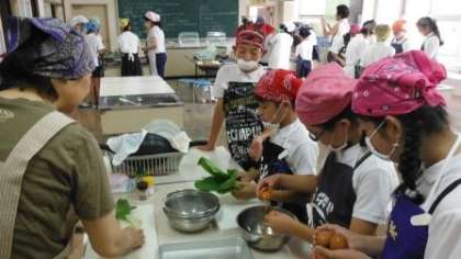1・2時間目、家庭科の「いためてつくろう、朝食のおかず」の学習で、調理実習をしました。フライパンを使って「チンゲンサイとハムの油炒め」と「スクランブルエッグ」を作りました。エプロンは、この5月に自分達で作ったものです。