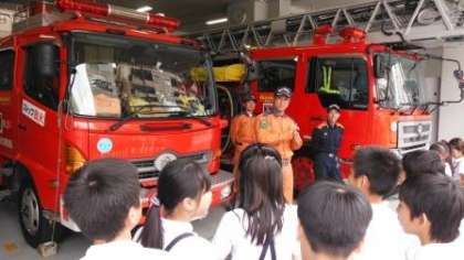 4年生が西消防署の見学に行きました。まず消防署のお仕事を紹介するDVDを見ました。次に、通信指令室を見せてもらいました。西消防署には大阪市内で唯一の通信指令室があり、大阪市内の119番通報を全て受け付けています。実際に119番通報を受け付けている場面も見学できました。最後に1階の大きな駐車場で消防車や消防隊員の方の装備などを見せてもらいました。実際にはしご車に乗せてもらったり、装備を装着させてもらったりしました。子どもたちは大喜びでしたヽ(^。^)ノ