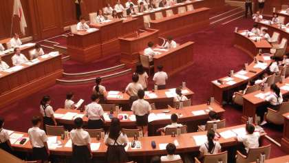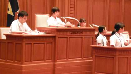 8月23日(火)に大阪市役所で大阪子ども市会がありました。九条東小学校の6年生の児童3人が参加しました。「地下鉄の安全性について」や「より安全な水を提供する方法」について話し合いをしました。その中で、議会で発表したり議長の大役を担うなど3人ともしっかりと参加できました。