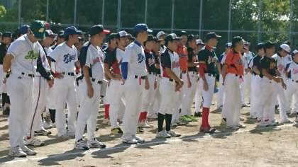 晴天のもと、松島球場で西区PTAソフトボール大会が開催されています。