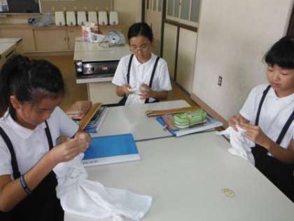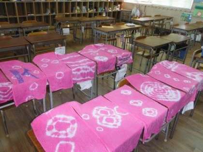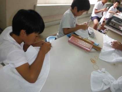 5年生は図工の時間にタオルのしぼり染めを行いました。子どもたちは、「どこを、どうしぼれば、どんな模様になるかな?」と、想像をめぐらせながら輪ゴムを使ってタオルをしぼりました。今日は男子班が染め上げました。輪ゴムのとめる位置や強さが様々で、どれも個性あふれる素敵なタオルになりました。月曜日は女子班が染め上げる予定です。