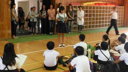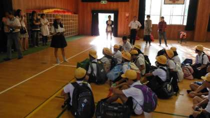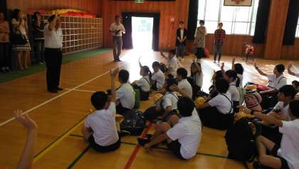 講堂に集合して出発式をしました。校長先生や藤田先生のお話のあとに、児童代表からあいさつがありました。