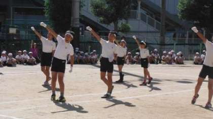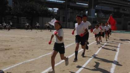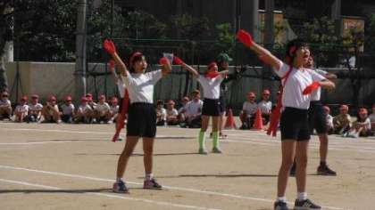運動会の全体練習で、応援合戦の練習をしました。