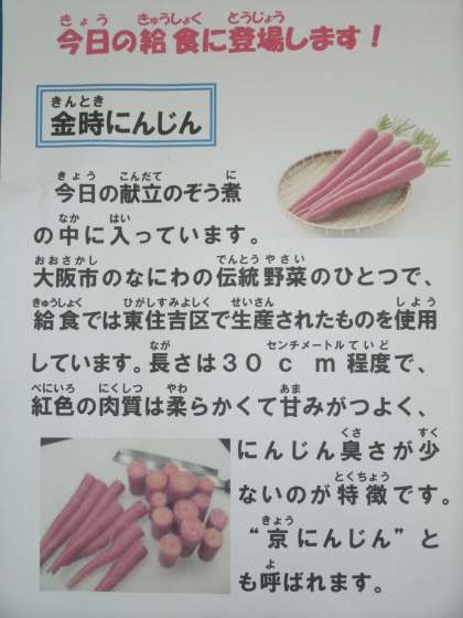 1月8日の献立は、「ちらしずし」「ぞうに」「ごまめ」と牛乳でした。雑煮には、なにわ伝統野菜の金時人参が使われていました。みんなおいしそうに食べていました。