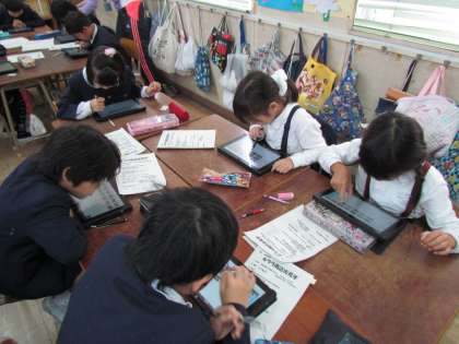 タブレットや授業で使うパソコンの使い方を教えてくれるICT支援員に来ていただきました。今日は全ての学年でタブレットを使った授業を行いました。