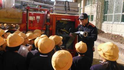 消防車の見学では消防車に積んである道具などを見せてくれました。みんな興味津々です。