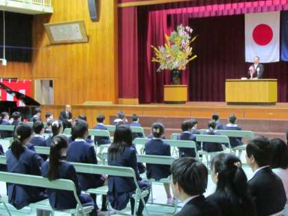 講堂では校長先生が「大きな声であいさつしよう」「先生の話をしっかり聞こう」とお話しされました。