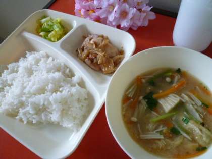 4月17日(月)の給食は、ごはん、鶏肉の甘辛焼き、みそ汁、キャベツの梅風味、牛乳でした。