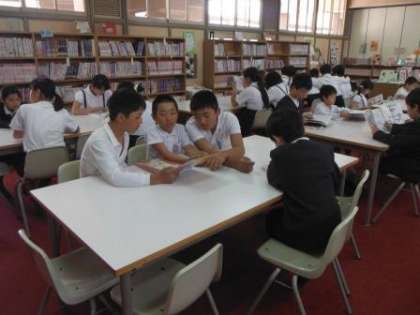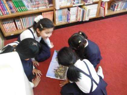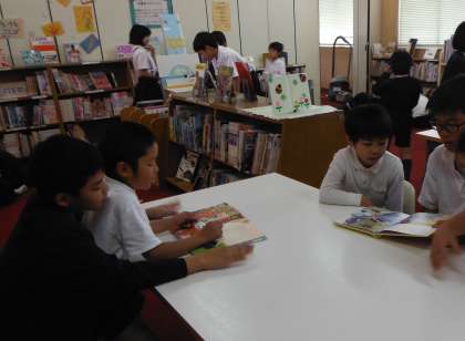 図書室での読書タイムは異学年交流の場でもあります。今日は6年生が2年生に読み聞かせる場面や、2年生が読んでいるのを6年生が「上手やね。ありがとう。」と声をかける場面が見られました。
