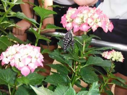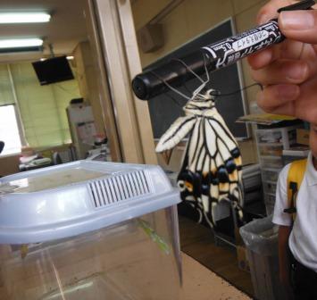 3年生の子どもたちが育てていた、アゲハチョウが羽化しました。社会見学に出発する直前です。廊下に並ぼうとした子どもたちが「先生!アゲハチョウがさなぎから出てきてる!!」と大騒ぎ。出てきたチョウは、その後すぐにケースの中で落ちてしまい、急きょペンにつかまらせて無事救出。そのままチョウを学校の玄関先に咲いているアジサイの上へ。花のみつをすっている様子も見れて、子どもたちは大興奮でした。