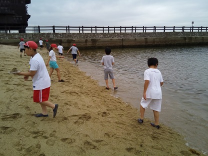 近くの浜辺で浜あそびをしています。クラゲがいっぱいです。