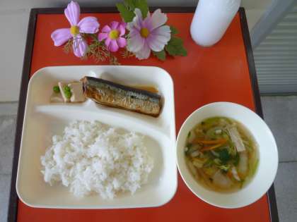 10月30日(月)の給食は、ごはん、さんまのさんしょう焼き、すまし汁、高野どうふの煮もの、牛乳でした。