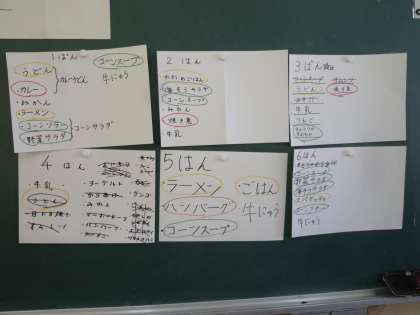 まず班でバイキング給食にチャレンジしてから、栄養バランスのよい組み合わせについて学習しました。すきなものばかり、食べたいものばかりを選ぶと、あまりよくない栄養バランスになってしまうことに気がつきました。