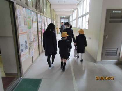 玄関で受付をした1年生は名札をつけてもらい、6年生に案内されて教室までいきました。いよいよ入学式です。