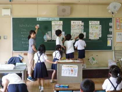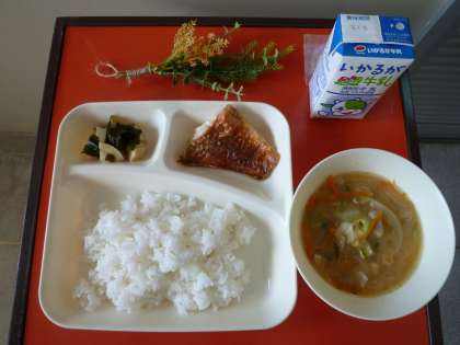 きょうの給食【ごはん、赤魚のしょうゆだれかけ、みそ汁、わかたけ煮、牛乳】を3つのグループに分けて、給食は栄養バランスが考えられていることを改めて知った子どもたちです。
