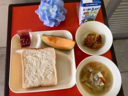 6月6日(水)の給食は、食パン、いちごジャム、カレードリア、スープ、クインシーメロン、牛乳でした。