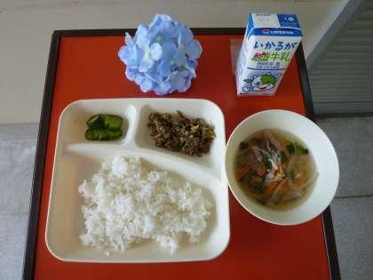 6月8日(金)の給食は、ごはん、チンジャオニューロウスー、ハムと野菜の中華スープ、きゅうりの辛みづけ、牛乳でした。