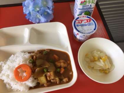 献立は、チキンカレーライス、キャベツとコーンのサラダ、ヨーグルト、牛乳でした。