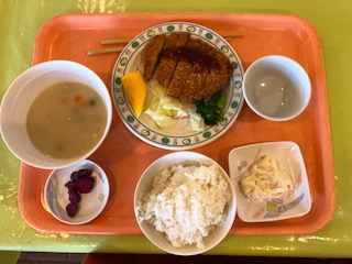 ご飯 トンカツ ポテトサラダ クリームシチュー 漬け物 です。