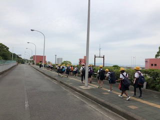 写真はセンターからの帰校の様子と帰校式の様子です。