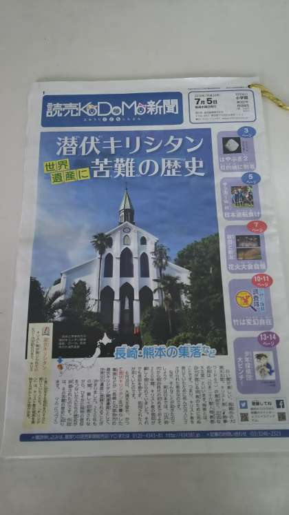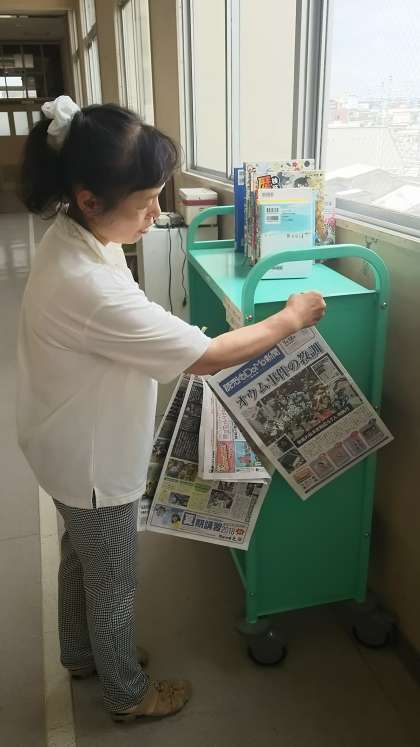 先月下旬より、高学年(5年・6年)の教室の廊下に配置しているブックトラックに図書支援員の岡田さんが毎週、「読売KoDoMo新聞」を設置してくれています。岡田さんには「次はいつ出るん」との質問も寄せられており、愛読者も増えていっています。